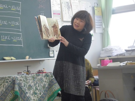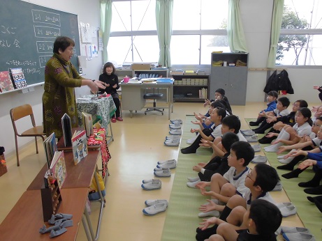 22日(水)2限目、2年生のクラスに、おはなしボランティア「やまんばさん」がおはなしを届けに来て下さいました。「もちっこやいて」のてあそび、「へんなひとかぞえうた」の後、「ねずみのすもう」「じゅうにしのおはなし」の絵本を読んで頂きました。最後に「おにとあんころもち」の素話をろうそくの灯りの中、じっくりと聞きました。いろいろな民話や昔話を紹介して頂いたり、ももたろうの歌を歌ったり、オカリナでの日本昔話の演奏を聴いたりと、あっという間のおはなし会で、みんなとても楽しそうでした。やまんばさん、またぜひ来て下さいね!