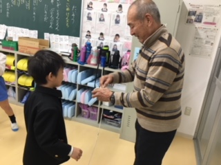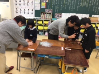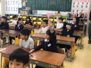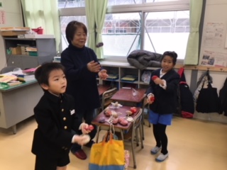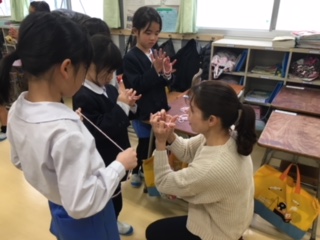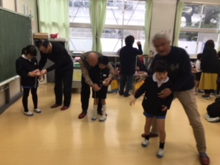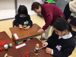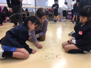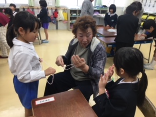 地域のボランティアの方々にゲストティーチャーとなっていただき、1年生が昔遊びに挑戦しました。コマ回し・あやとり・お手玉・おはじきなど、昔から伝承されてきた遊びですが、家でする子は少なく、初めて体験する子もたくさんいました。地域の方々に優しく教えていただき、子ども達はたっぷり楽しんでいました。