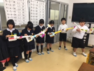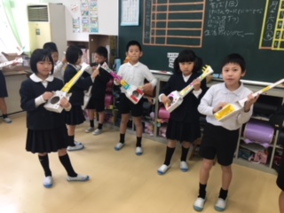 職員室前の2年教室から楽しい音楽が…のぞいてみると、図画工作で作成したギターを持ち、かっこよくみんなで弾いていました。今月の歌や校歌など、音楽に合わせてノリノリに演奏して、とっても楽しそうでした。