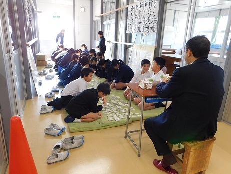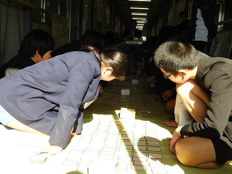 仮校舎なので札をひろげられる教室がなく、ろう下にゴザを敷いて練習しています。いつもは寒いろう下ですが、太陽が出て暖かい日となり、みんな練習に集中することができました。