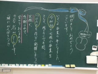 担任の先生方は、明日久しぶりに会う子ども達を迎えるための準備を嬉しそうにしていました。各クラスの黒板には、七塚小恒例の黒板メッセージが…。どのメッセージからも、担任の先生の期待と愛情が感じられます。