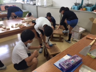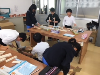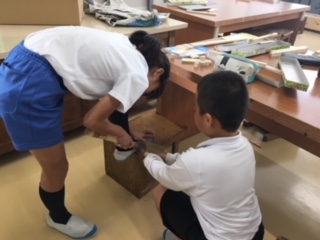 4年生が、板や木切れをのこぎりで切り、楽しく制作していました。最後に切り落とすときには、だれかに持ってもらうときれいに切り落とせることを知り、自然に助け合っているところが、素敵でした。