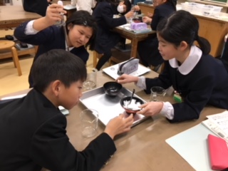 5年生が、理科実験を行っていました。食塩とミョウバンを一生懸命溶かしながら、水に溶ける様子を観察しています。実際に実験を通して友だちと一緒に楽しく学んだ知識は、楽しい思い出とともに子ども達の心に残りますね。