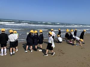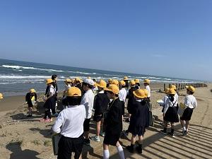 総合の学習で1学期は海について調べることに決まりました。七塚の海の現状を知るためにみんなで海を見に行きました。海や砂浜から気付いたことをたくさん記録していました。