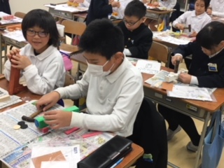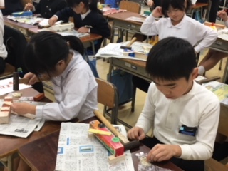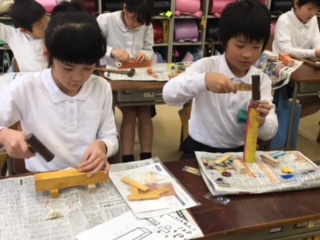 3年生の教室から、トンカントンカンという音が…図画工作の時間に釘打ちをしていました。初めて使う金づちをぎこちなく使いながらも、自分の思い通りの作品を作ろうと一生懸命取り組んでいました。