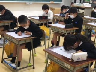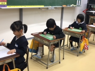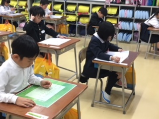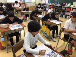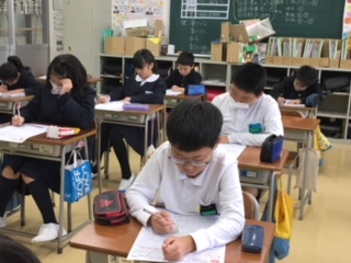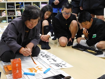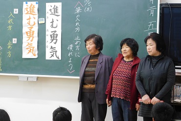 昨日から、書写の時間に書き初めの練習が始まりました。3名の書道のボランティア先生に来ていただき、4年生と5年生にご指導いただきました。4年生の課題は「流れる星」5年生は「進む勇気」です。