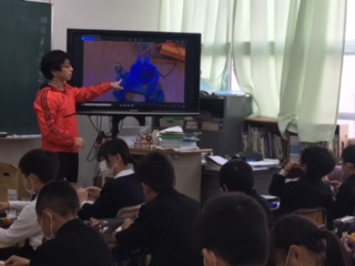 3年理科の電気回路をつなぐ授業です。細かい導線のつなぎ方も大きな画面で見やすくして説明しています。
