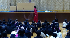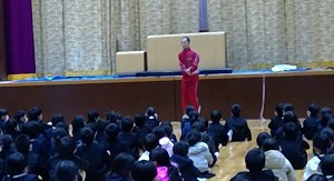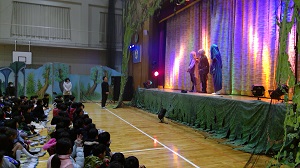 昨年も来ていただいた劇団「青い鳥」の方々が素晴らしい演技や演出をしてくれました。映像や舞台・音楽などで様々な演出を行い,児童たちは楽しい時間を過ごすことができました。
