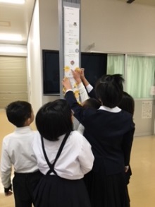 1F保健室前の柱には身長計が貼られ、子ども達同士で身長比べができるように。のび太君やドラえもんなどのキャラクターの身長とも比べられるようになっていて、低学年の人気の場所です!