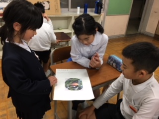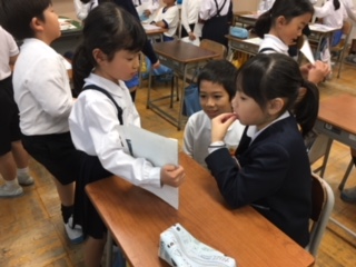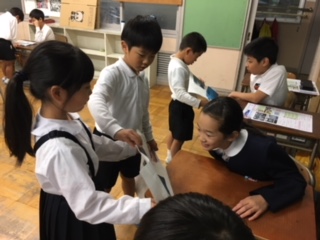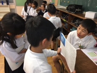 1年生が国語科の学習で作った生き物クイズを持って4年教室へ。