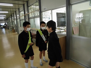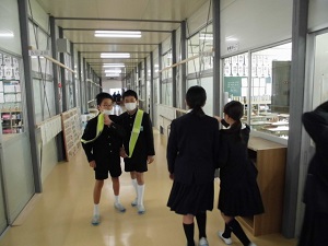 企画委員会の児童が、校内を回って「こんにちはあいさつ」を行っているところに出会いました。また、低学年の児童に「廊下を歩こうね。」と声をかけていました。