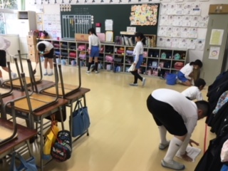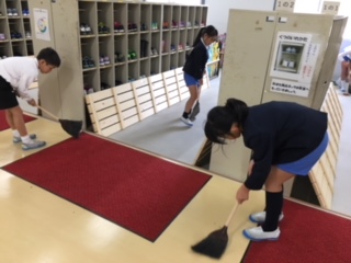 仮校舎での初めての掃除です。きれいな教室・きれいな廊下を維持できるように、全員で掃除しました。みんなで大事に使いたいですね。