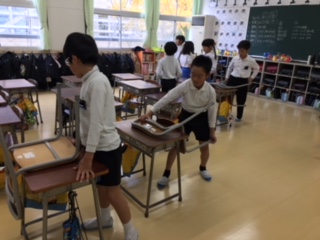 2019年11月20日 10時00分仮校舎での初めての掃除です。きれいな教室・きれいな廊下を維持できるように、全員で掃除しました。みんなで大事に使いたいですね。
