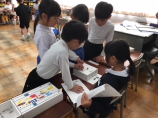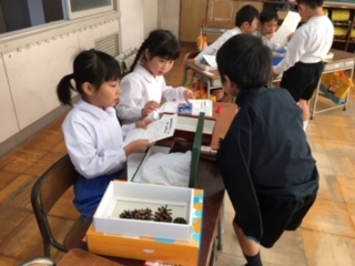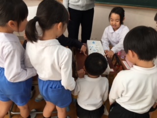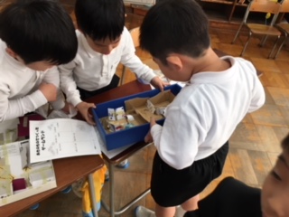 1年生の秋のお店屋さん。どのお店も、秋の木の実を上手に使って、遊び道具や品物が作ってありました。お客さんも店員さんも一緒に楽しんでいました!