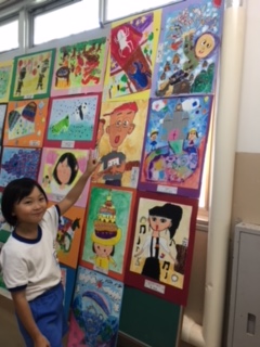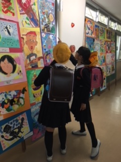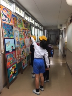 各校の優秀な図画作品を巡回する河北郡市図画作品展。低学年の作品が、本校に届きました。自分の思いを画用紙いっぱいに表現した力作揃いで、どの児童も関心深く鑑賞していました。