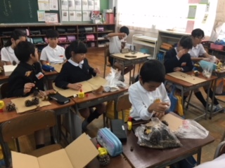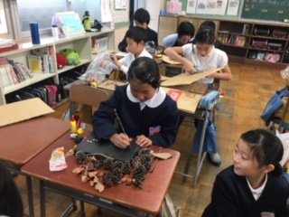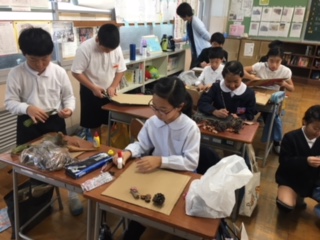 2019年11月10日 12時49分4年生が、図画工作の時間、木の枝をどんどんつないで、造形遊びを楽しんでいまし。材料は、木津公園からたっぷり集めてきたので、どの子もどんなつなぎ方をしようか組み合わせ方を工夫しながら楽しんでいました。