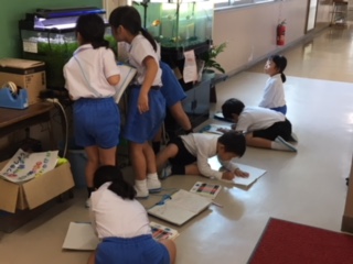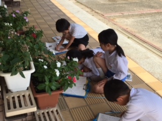1年生が、観察力を磨こうと、国語の時間に学校の生き物や植物の観察をしていました。見たことを、言葉や絵で的確にメモする力は、今後の学習にとても必要です。教室で学んだ観点をもとに、どの子も真剣にメモしていました。
