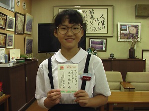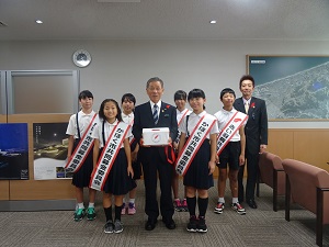 6年生の能戸さんは、市共同募金委員会の一員として募金活動に参加し、市長に報告に行きました。
