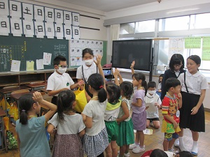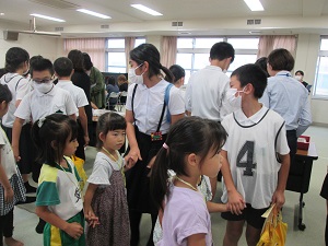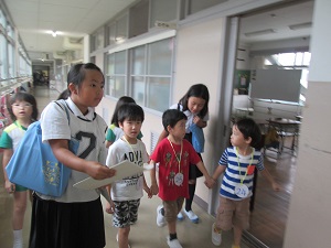 来年度6年生となる5年生が、毎年就学時健診のお世話をしています。園児達が安心して入学できるようにと、5年生の子ども達は、優しく楽しく対応していました。園児達も、5年生と仲よくなって、みんな笑顔で検診を受けていました。