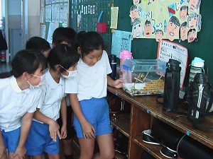 3年生の竹藤さんが、羽化する様子をみんなで見ようと、さなぎを教室にもって来てくれました。夏休みに自由研究で観察をしていたそうです。ちょうど授業中にさなぎが殻を破り、ちぢれた羽を開いていく様子をみんなで見ることができました。初めて見る子が多く、みんなで感動していました。