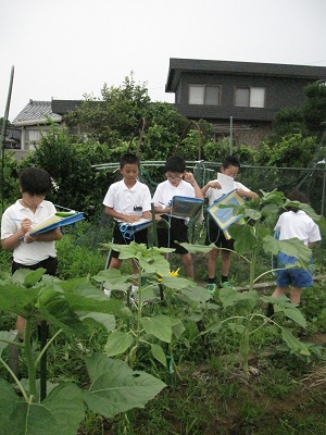 3年生が育てたヒマワリ・ホウセンカ・ピーマンの観察を行いました。