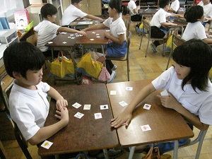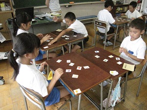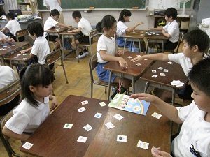 児童はスタンプゲームやビンゴゲームをしながら,楽しく英語に慣れ親しんでいます。
