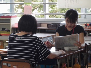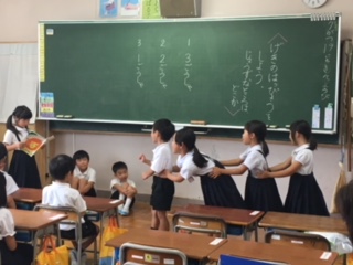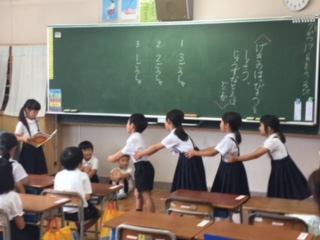1年生教室から、元気な声が聞こえてきます…のぞいてみると、国語科の「おおきなかぶ」の音読劇をしていました。「うんとこしょ、どっこいしょ」と大きな声で音読しながら、自分の役になりきっている姿は、とてもほほえましかったです。
