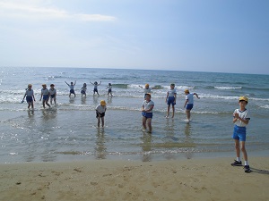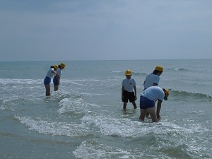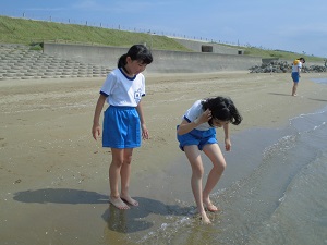 児童は海岸で貝やヤドカリを見つけうれしそうにしていました。
