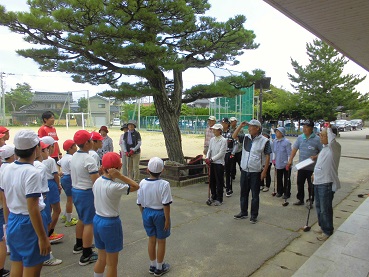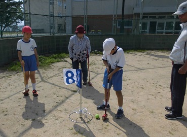 七塚グランドゴルフ協会の15名と一緒にグランドゴルフを体験して交流しました。高学年は何度か経験があるので、楽しんで体験できました。