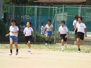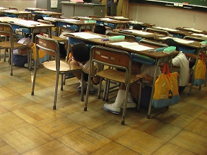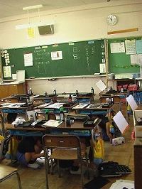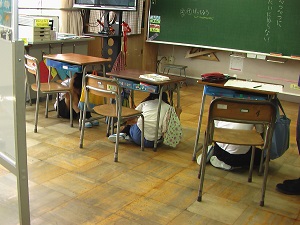 休み時間、突然鳴った放送に対し,児童は素早く避難行動をとりました。