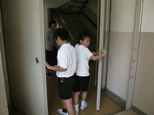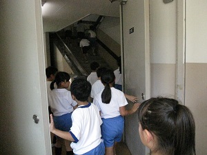 集会後、防火扉を開けて安全に避難することを学習しました。いざというとき、自分たちの力で安全に避難できますね。