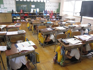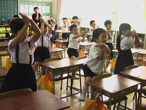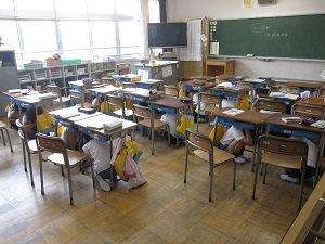 緊急地震速報の音楽が聞こえると、子ども達は何も言わずにさっと机の下にもぐり、頭を守りました。