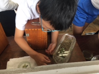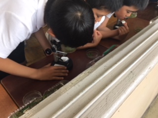 5年生の教室で、今メダカを育てています。今日は、顕微鏡を使って観察をしていました。雄かな雌かな?卵は大きくなっているかな?など、視点を持っての観察です。顕微鏡も上手に使えるようになり、スケッチも丁寧になってきました。