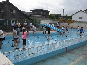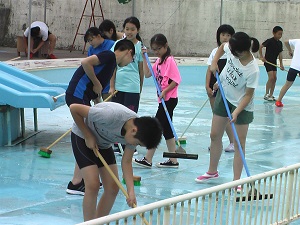 プールの水がなかなか抜けないというハプニングもあり、児童のバケツリレーで水を抜いていきました。大変な作業をどうもありがとう!6年生