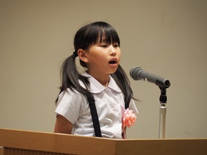 「いのちのおしごと」と題し、看護師であるお母さんが、赤ちゃんとお母さんの2つの命を守る尊い仕事をしていることや自分の命を大事にし愛してくれていることを知り、お母さんに感謝する気持ちを、堂々とした素晴らしい態度と聞きやすい声で伝えるができました。