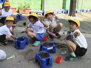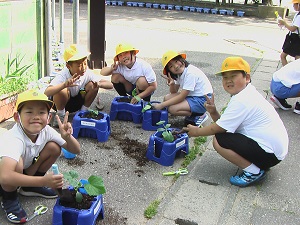 2年生が、ミニトマト・ピーマン・なすなど、自分の好きな野菜を選んで苗を植えました。大きく成長して実がなることを楽しみにしながら、一生懸命に植えていました。