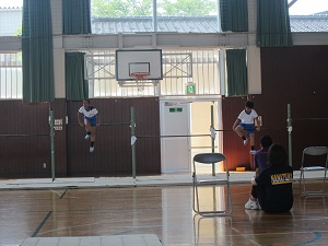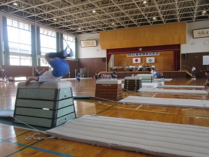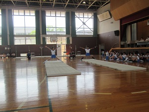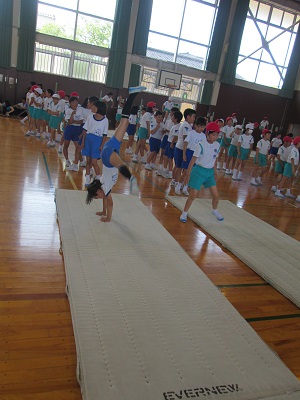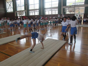 跳び箱からはじまり、マット、鉄棒と演技が進みます。七塚小の息の合った演技や、マットのすごい技を褒めてもらえました。器械運動交歓会を大成功で終えることができ、子ども達も満足そうにしていました。