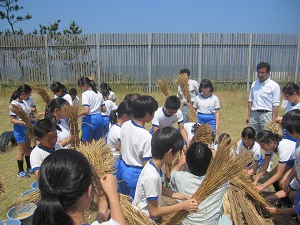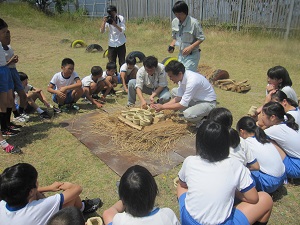 縄文時代の服を着たり、火起こしを体験してみました。火を手軽に使える今とちがって昔の生活は大変だと感じたようです。