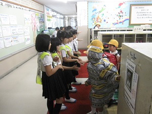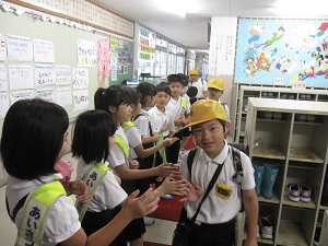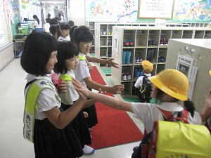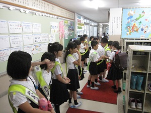 あいさつ運動を3年生がしています。
