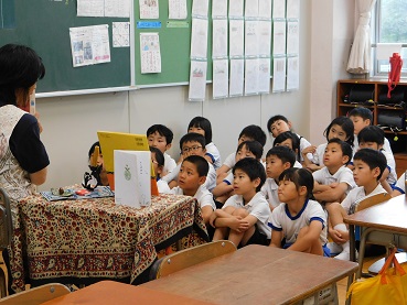 2019年6月7日 10時50分朝の読書の時間に、ぴーかーぶー文庫の坂本さんに読み聞かせをしていただきました。