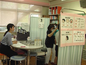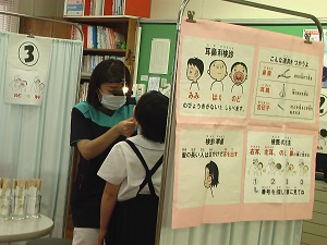1年生と4年生が耳鼻科検診を行いました。診てくださったのは、はまなすクリニックの寺口先生です。検査の受け方の説明を聞いた後、みんな緊張しながら検査を受けました。
