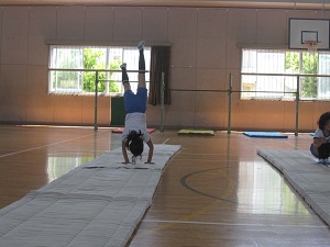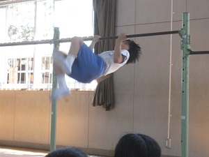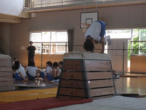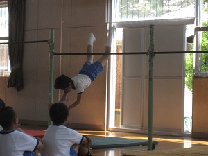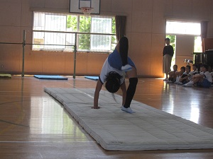 4年生が全校の前で器械運動のリハーサルをしました。