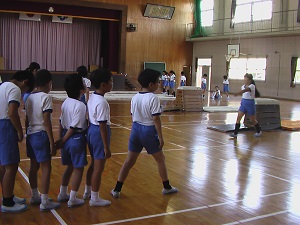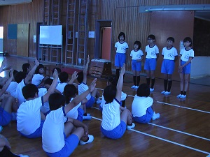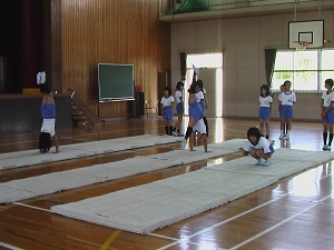 本番での美しい演技をめざして、4年生ががんばっています。練習の始まりと終わりを5人の実行委員で行っているのも、主体的な姿につながっています。