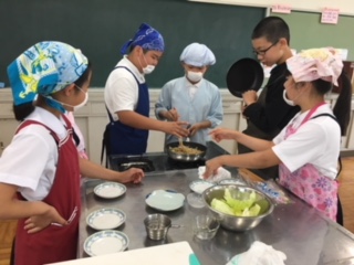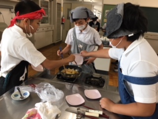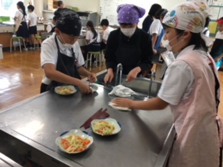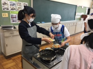 家庭室からいいにおいが…6年生が、調理実習をしていました。野菜炒めに初めてチャレンジする子も多かったのですが、各グループで協力しながら作っていました。お家でも作ってみてね。