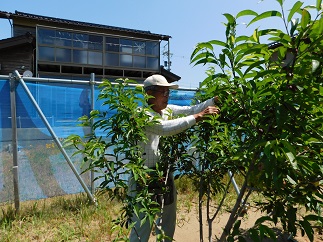 2019年5月24日 09時33分 梅雨前に、木津桃の消毒と実の間引きをします。