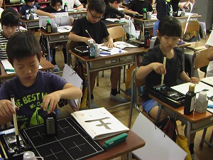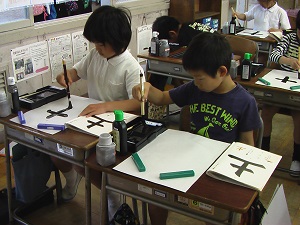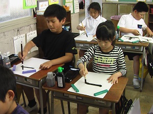 道具の準備も上手になり、今日は縦画と横画のある「土」という文字に挑戦です。姿勢を正して緊張しながらも、みんな一生懸命に練習していました。