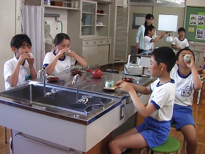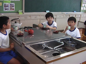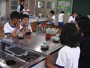 5年生が、家庭科でお茶を入れる学習をしていました。お茶を飲みながらだと、自然と話も弾み笑顔がこぼれますね。お家でも美味しいお茶を入れて、家族と団らんし、がんばっていることや将来の夢について語り合ってほしいです。