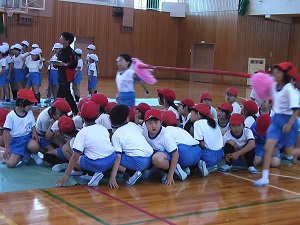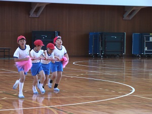 3・4年生の団体競技のぐるぐるタイフーン。それぞれの学年目標「協力して何にでも挑戦する3年生」と「自分から行動し、相手を想う4年生」を実行できる絶好の競技です。赤白力を合わせて、がんばってね!