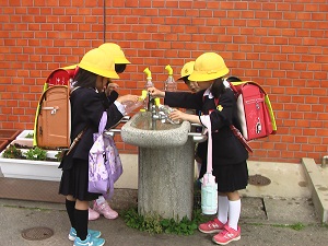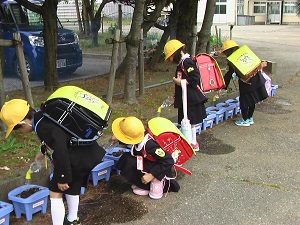 登校時、毎朝1年生は朝顔の水やりから始まります。
