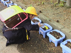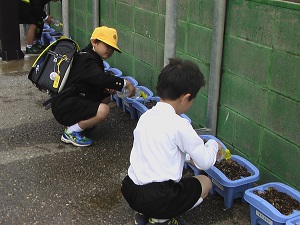 自分の植木鉢に優しく優しく水やりをしている姿は、とてもほほえましいです。芽が出てくるのが待ち遠しいですね。
